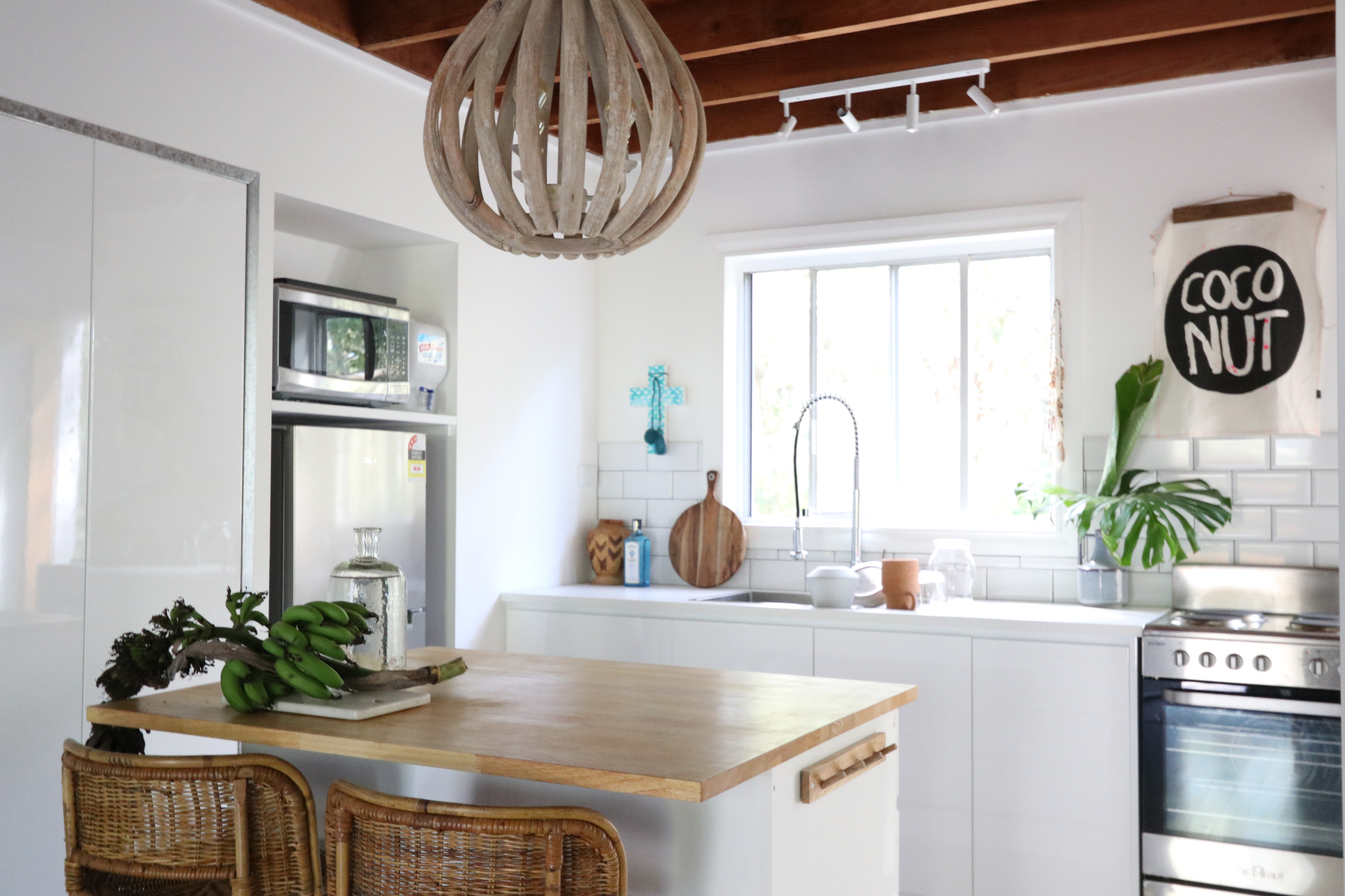 Artisan pieces and locally sourced vintage furniture feature throughout, such as cane and rattan pieces from the ’70s sourced from nearby op shops and secondhand stores in Forster and off Gumtree, artwork by Byron-based artist Jai Vasicek, and a piece by a local weaver purchased from a homewares store in Islington.