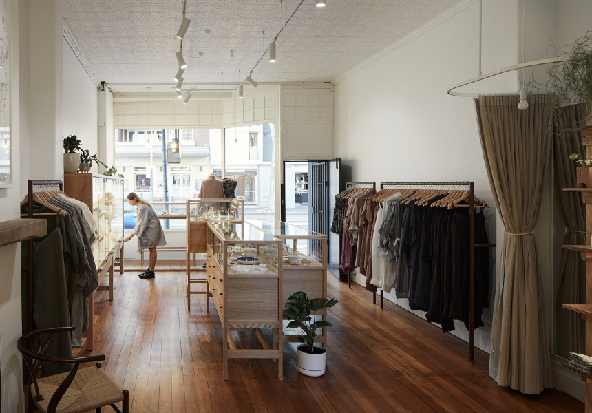 The Sydney store showcases sustainable clothing and accessories by High Tea with Mrs Woo. Founded in 2004 by sisters Rowena, Juliana and Angela Foong, the label designs and makes each piece in its Newcastle studio using traditional tailoring methods, with a focus on low waste and longevity.